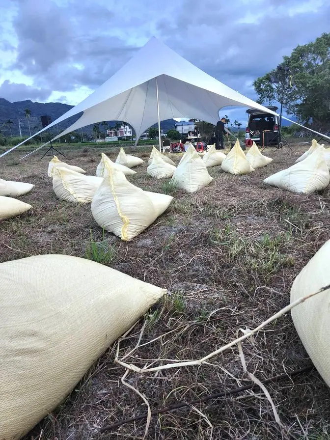 接近傍晚時分,準備迎接音樂會,一袋袋裝著稻殼的麻袋便是椅子
